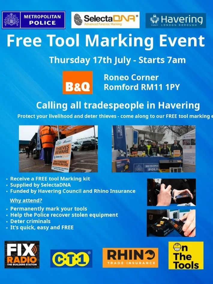 - Havering Police are organising a free tool marking event to combat the rising issue of tool theft.